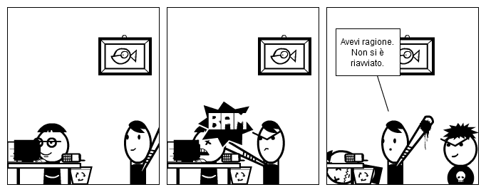 A questo punto mi e' venuto il dubbio che fosse entrata in loop e, visto che proprio in quel momento stavo reggendo il Cisco 1700 con entrambe le mani, mi sono domandato se valesse la pena lasciarlo andare sulla testa dell'utOnta. Pero' ho pensato che sarebbe stato troppo pericoloso e mi sarebbe dispiaciuto creare un danno. Per il Cisco, ovviamente.